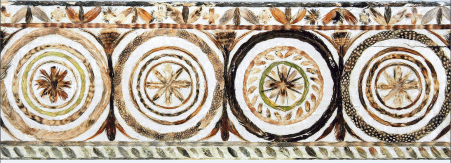 Everything that can be done with pointed scissors, neat gum-brushes, fairy-like needles, with shells, seaweeds, and feathers, they did excellingly. The drawing room walls are decorated with feather-work: small breast feathers laid on in geometrical patterns, looking at first sight rather like mosaic, but keeping a softness and vague sleekness of something animal.